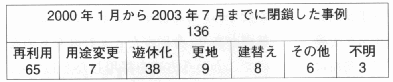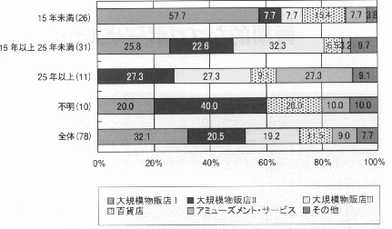 | 注 注1) 閉鎖事例の抽出は、4 社については各社のニュースリリースおよび検索エンジン(キーワード=社名×閉鎖)データ、4 社以外については、全国の商業施設動向に関する隔週発行の情報紙「タイハン特報」の2000 年1 月6 日号から2003 年7 月14 日号の中の閉店情報によった。 注2) 2003 年12 月末データであり、小売業者の店舗面積が1,000 ㎡以上かつ店舗数が10 以上のものを対象としている。 注3) 各店舗の立地する市町村の商工会議所または商工会の大規模店舗担当宛に質問紙による郵送調査を行い、全部で136 の回答(回収率59.9%)を得た。 注4) この調査の2年後に遊休化事例の追跡調査を行ったが、38 事例中22 事例が依然として遊休化の状態であった。 |