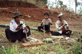| 1年のうちに雨季と乾季を繰り返すモンスーンアジアには、わたしたちが普段目にするのとは異なる生態世界がある。 4月ごろから降り出す雨は、籾米をまく時期の到来を告げる。作物の生育にとっては大いなる恵みの雨なのだが、8月ともなれば、1日中降り続くことも珍しくない。北タイの山地に住むアカ族は、8月から9月を「雨を呼ぶ月(イェクバラ)」と呼ぶ。冷たい雨を降らす雲が村を覆ってしまうこの時期は、稲刈り前に当たり、かつては、前年に収穫した米を食べ尽くしてしまうことも珍しくなかった。食料に乏しいこの時期を耐え忍び、10月ごろに雨季が終われば、待望の新米の収穫を迎える。そして、雨が1滴も降らない極度に乾燥した季節が、翌年の3 〜4月まで続く。 雨季に好んで成長するのが竹である。種類によっては、1日に1メートルも伸びるというこの植物は、もともとは南米が起源とされる。温暖であることに加えて、水分条件も適合するこの地に、持ち前の繁殖力によってまたたくまに広がった。 豊富に自生する竹は、この地域のさまざまな文化にも深く関与している。竹でつくられたものの種類は数え上げたらきりがない。枝を断ち落とした竹竿は、そのままで物干しや釣り竿になる。なかの節を抜けば笛やパイプになる。昨春、ラオス南部で調査したときには、小ぶりの竹でつくった自家製のパイプで、うまそうにタバコを吸う老人たちに出会った。節を抜いた筒は、水筒や酒筒にもなる。ラオスやタイの農村では、現在でも、長い竹筒に付近の川や池から汲んだ水を満たし、村へと運ぶ子供たちの姿をよく見る。細かく割り、薄くなるまで身を削ったへぎを網代に編めば、多種類のかごをつくることができる。ニワトリやアヒルなどの家禽に加えて、この地域の人たちはブタさえもかごに入れる。貴重品や生活財を収納するかごもあれば、野菜や肉を入れるかご、蒸したもち米を入れるかごもある。ティップカオと呼ばれるラオスのそれは、網代編みの蓋を持ち、幅広の竹のへぎを胴下に回して足をつくっている。 生業とのかかわりでいえば、農業に欠かせない背負いかご、雨や日差しをよける笠も竹製だ。農業ばかりでなく、魚を獲る筌うけや魚伏せかごも竹製である。北ラオスでは、全長2メートルを超える巨大な筌を使う人びとがいる。竹菅を利用した楽器、椅子やテーブルなども一般的だし、節を土台にした湯のみや竹から削り出した箸も見慣れたものだ。この地域の人びとの日々の営みに欠かせない生活道具は、ほとんどが竹製なのである。 |