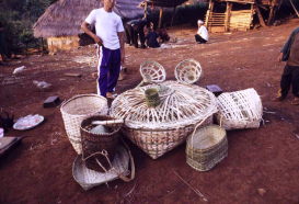 | 柱も壁も床も竹でつくられたアカの家屋(北タイ) | 竹でつくられたさまざまなかご類(アカ、北タイ) | |