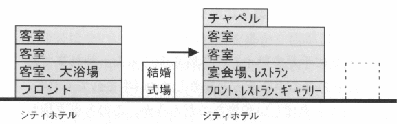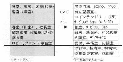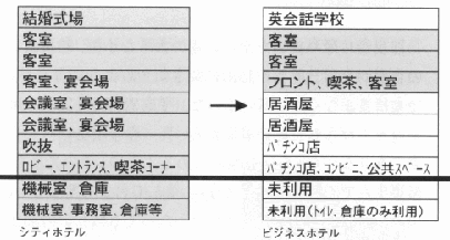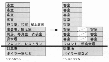| ホテル建築の特徴は、求められる空間ボリュームや最適な構造形式などが異なる料飲部門と宿泊部門が同居している点にあり、また料飲部門は景気の変動に大きく左右される。閉鎖ホテルの有効利用の鍵はこの料飲部門の扱いにある。「再利用」では、この空間を現在置かれた市場環境の中でいかにうまく活用するか、「用途変更」では料飲部門と宿泊部門が共存する形態と新用途との適合性が重要である。また、敷地近傍の主体も含めた周到な地域特性の把握が求められる。 | |||
