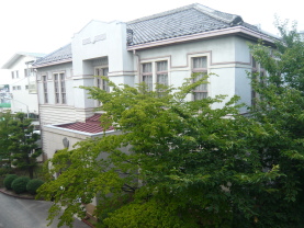 | ■紹介者のコメント 笠松町は、木曽川、長良川、揖斐川など諸河川の治水のため、寛永2年(1662)に郡代陣屋が設置され、美濃国内の幕府直轄領を治め地役所と治水行政にあたる堤方役所が併設、江戸時代200年余に及ぶ国の重要な位置をしめていた地域である。今回紹介する岐工記念館は、昭和4年に岐阜県工業試験場の本館として創建された。県工業試験場は繊維産業従事者や地場産業の育成に成果をあげたとされている。また、昭和21年には、昭和天皇が岐阜県内巡幸の際の御在所とされたようである。昭和47年に岐阜工業高校に移管された際に工場はすべて取り壊されたが、本館は当時のまま残された。その理由は定かではないと聞いている。 本館は、1階が下見板張り、2階部分がモルタル塗り、L型の木造建築物でトラディショナルとモダンが融合した洋風建築である。南正面玄関ポーチ部分は、現在は洗い出し風の仕上げとなっているが、昭和33年頃の写真では下見板張りでパラペットボーダー部にはアールデコ風の装飾がなされていた。そのまま残されていればとの思いが強く残った。 東玄関の上部の出窓も、トラディショナルとモダンの見事に調和したデザインが印象的であった。現在は、学校の一部の施設として幅広く活用されている。 今回案内をしていただいた教頭の高橋信行先生より、修復予算確保が今の時代なかなか難しいとの説明を受けたが、今後も適切なリノベーションを経ながら活用、維持されていってほしいものです。 所在地:岐阜県羽島郡笠松町常盤1700番地 登録番号:21-0025 参考資料:岐阜県近代化遺産総合調査報告書、笠松町 歴史民族資料館資料 |