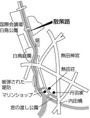 | ■発掘者コメント 小学校に入学した頃、父の仕事の関係で、千年(ちとせ)の近くに住んでいました。6月5日熱田まつり(尚武祭)になると、夕方、父と大瀬子橋を渡り、近くの堤防にもたれかかりながら、堀川に浮かんでいる提灯に明かりが点いた巻き藁船を見たのを記憶しています。今では熱田神宮の東、西門にそれぞれ2基、南門に1基飾られますが、昔は提灯の明かりが水面に映り、綺麗で幻想的でした。 今は常夜灯が復元され(昭和30年)、宮の渡し公園として整備されました。その場所を訪れると当時の桑名までの海路の船着場として、東海道そして熱田神宮の北(新尾頭)あたりから佐屋街道、飛騨路へと分かれていく要所であった門前町でもあり、宮宿でもあった賑わいが伝わってきます。周りには市の有形文化財に指定されている「熱田荘」「丹羽家」や米蔵(大正時代)を改修したマリン用品を扱っているお店などや史跡が多くあり、これらの資源が堅苦しいものとしてではなく、庶民の生活空間に愛され親しまれ、今後のまちづくりに活用されていくことが期待されます。 さて、公園を後にして、西に向かって大瀬子橋を渡り右へ折れ、川沿いに整備された散策路をしばらく北へ歩くと、太平洋戦争で当時の堤防に熱田大空襲(昭和20年6月9日)でできた弾痕の跡の記念碑があり、この辺りは軍需工場が多くあったことを改めて知らされます。さらに北へと進み、白鳥橋(国道1号線)を潜り抜けると、白鳥庭園の入口があり、緑と水辺を生かした白鳥公園(デザイン博会場跡地)へと続きます。都心部の堀川と違い、しばらく時を忘れさせてくれるような心地よい風が水面を流れ、気持ちのよい素敵な親水の景観をつくっています。 |
