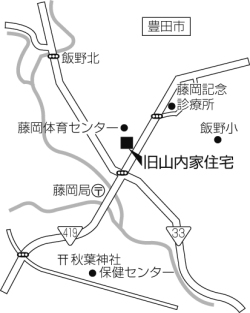 | ■発掘者のコメント この民家は、旧藤岡町役場(豊田市藤岡支所)の近く、約200m北東の小高いところにある藤岡交流館の一角に建っている。昭和45(1970)年に旧藤岡村大字木瀬から現在地に移築(復原)、藤岡村の当時の歴史を語る貴重な建物として保存されている。昭和50(1975)年には東海地方における鳥居建、広間型の農家として最初に愛知県の文化財指定を受けている。木造平屋建、茅葺、鳥居建構造、居室部(床張り)とにわ部(土間)に二分されただけのシンプルな長方形平面である。『愛知の民家』には、「山内氏宅の全体の構造は、鳥居建形式の典型的な構造である。この鳥居建構造は、西加茂郡・東加茂郡に今なお多くの例が見られる。解体調査によって建築年代は特定できなかったが、各種の詳細な調査結果から、18世紀前半の建造であると判断している。山内氏宅が建造された時期までは、鳥居建が竪穴式住居から発達してきた証明とも言うべき、上屋と下屋の礎石高さに高低の差がみられる。床を張るようになっても古い形式を残した建造がなされた最後の構えと言える」と書かれている。なかなか興味深い記述である。 この民家の中に一歩踏み入れると、竪穴住居の内部にいるように感じさせる。薄暗く、間仕切壁がなく、ところどころに柱が立っているだけの一室空間である。これがすまいの原型であるような。民家は時代とともに、生活の変化とともに内部空間が分割され、より複雑に変化していく。そんななかで、たとえ非合理的であっても、古い形式を残していく部分がある。そこから日本的、伝統的な空間が続いていくように思う。 参考資料:『愛知の民家』(愛知県教育委員会 1975年) 所在地:豊田市藤岡飯野町仲ノ下1048-1 |