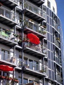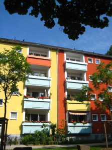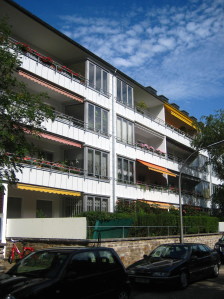 | ドイツと日本における集合住宅の違いの一つは、各住戸への動線であろう。ドイツでは、日本の公営住宅に見られるような階段室型が圧倒的に多いが、日本では、超高層などの特殊な事例を除くと、ほとんどが廊下型だといえる。そして、もう一つの大きな相違点は、バルコニーの形態ではないだろうか。ドイツの最近の集合住宅には、外壁面から外に大きく張り出した開放的なバルコニーが設けられていることが多く、外側に鉄骨を組んだ事例も少なくない。逆に日本では、外側に張り出すというよりも、むしろ躯体と一体化した奥行きの浅いものが大半を占めているように思う。この外部空間はベランダとかバルコニーと呼ばれているが、ここではあえて外壁面から大きく張り出したものをバルコニー、そうでないものをベランダと使い分けることにする。 さて、ドイツの集合住宅の変遷をみると、1920年から30年代に建てられた集合住宅には、すでに小さなベランダが設けられていた。その面積は時代とともに次第に大きくなって来たが、1970年代くらいまでは現在の日本の集合住宅に見られるような、外壁の内側に配置された事例が多かった。それが大きく変化したのは1980年以降であろう。外側に張り出したバルコニーを持つ集合住宅が徐々に現れ始め、改修にともないバルコニーを新たに設ける事例も増えてきた。もちろん日本でもベランダのない集合住宅など有り得ないけれど、ドイツでは大きくて開放的なバルコニーのある住居の人気はとても高く、家探しの際の極めて重要な条件の一つになっている。 彼らがそれほどまでにバルコニーを切望する理由は、自宅にいながらにして太陽を浴びたいという願望が根底にあるからだろう。窓を開けて一歩を踏み出すだけで気軽に外の風を感じたり、陽射しを享受できることは、季節を問わず散歩に出かけるのが大好きなドイツ人にとって、大切な生活の一部なのである。もちろんこれはドイツの人に限ったことではないけれども、日暮れの遅い夏の夜に穏やかな風に吹かれながら、本を読んだり手紙を書いたり、友人や家族との会話を楽しむことのできるバルコニーの存在は極めて大きい。ビールやワインを片手に優雅に食事をしている姿は、見ているこちらの気持ちまでゆったりとした気分にさせてくれる。 |
