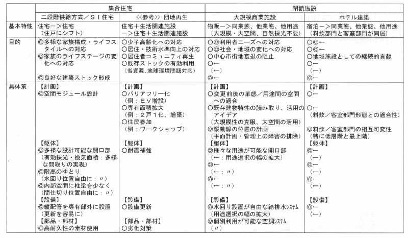 ![]() 表1 集合住宅と閉鎖施設の有効利用の比較(○既存 ◎新築 ← 同左) |
