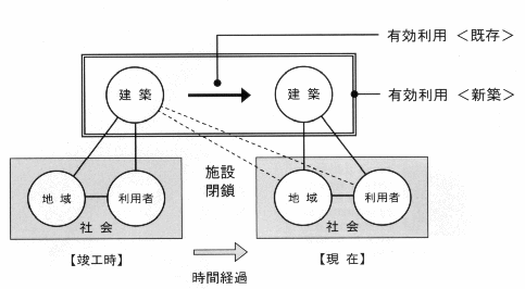 | 図1の通り、施設閉鎖とは、新築時に形成された建築と社会・地域・利用者との「適切な関係」が、竣工後の時間経過の中で「ちぐはぐな関係」に陥る現象である。そして閉鎖施設の有効利用とは、<既存>についてはこの関係の修復を建築側から行うことであり、<新築>の設計はこの修復を行い得る、いわばリセットできる力を建築に与えることにほかならない。今後とも、このリセットにかかわる知恵や技術を形成し、この力を持つ建築が確固たる選択肢の一つとなるよう力を尽くしたい。 | |||
