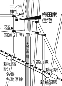 | ■紹介者コメント 中山道六十九次の江戸より52番目の鵜沼宿は、慶安4年(1651)に現在の地に設置された。宿場は東西7町半余(約820m)の長さで、ほぼ中央に大安寺川が横切る。中山道分間延絵図によればこの川を境に東町と西町に分かれ、西町に本陣・問屋場・脇本陣の記載がある。両町の街道内には水路が描かれ、小さな橋が架けられている様子も分かる。 西町では現在も旅籠遺構をはじめ、旧宿場の景観を伝える町家が軒を連ね、ほかにも菊川酒蔵の本蔵・豆蔵や二ノ宮神社拝殿など歴史的景観を形成する建物があり、いずれも登録有形文化財に登録されている。 旧旅籠「茗荷屋」の梅田吉道家住宅は旧宿場では唯一江戸時代の建築物で、2階建・切妻造平入り、正面1階には下屋庇と出格子、2階には長押と格子窓が付けられている。東隣の坂井家は明治27年建築の2階建・寄棟造住宅で、街道に面した門と塀で囲われている。西隣の梅田昭二家住宅は明治元年建築で、切妻造平入り、正面には下屋庇を設け、2階は長押と格子窓としている。 さらにその西側に旧旅籠「若竹屋」の安田家がある。現住宅は昭和5年に建てられ、切妻造平入り、下屋庇、出格子、長押、格子窓、鼠漆喰壁が当地域の町家の特徴をよく伝えている。 各務原市では2006年より宿場再生事業に取組み、現在、脇本陣復元工事(2010年公開予定)が行われているほか、今後は旧街道の水路の復元も計画されるなど、歴史的環境を生かしたまちづくりが進められている。 所在地 : 岐阜県各務原市鵜沼西町 登録番号: 梅田吉道家住宅(第21-0082) 坂井住宅(第21-0086、0088) 梅田昭二家住宅(第21-0106) 安田家住宅(第21-0110) 参考資料:各務原市ホームページ |
