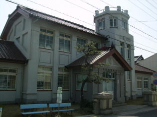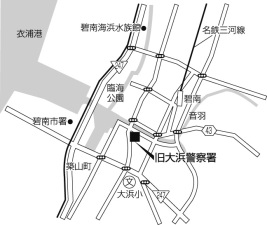 | ■発掘者のコメント 碧南の大浜堀川の、湊橋南岸に位置する旧大浜警察署は、大正13年(1924)に建設されました。もと安城警察署大浜分署の木造庁舎の老朽化に伴い、大浜町の寄付により、当時まだ珍しかった鉄筋コンクリート造に建て替えられたものです。大浜地区は、江戸時代から港町として栄え、みそや醤油、みりんなどの蔵や由緒ある寺が並ぶ街です。鉄筋コンクリート造の採用は、大正7年(1918)の米騒動や、大正12年(1923)の関東大震災を契機に、治安を守る上で最適であると考えられたからです。 外観の様式は、当時流行した直線的な幾何学模様で特色のある、セセッション様式を部分的に取り入れています。正面向かって右手にいかめしい八角形の塔屋がそびえており、治安上周辺を見渡したり、衣浦水道を出入りする漁の船などを監視したものと思われます。現在でも敷地の北西部には、漁に出る船のための気圧計「バロメートル」を埋め込んだ石柱が立っています。残念ながら中へは入れませんでしたが、塔へ続く木造のらせん階段には、美しい文様が施されているようです。登りきっての3階部分「汐見台」は周りすべてがガラス窓となっており、周囲が見渡せます。設計者は当時刈谷を中心に活躍した、大中肇と思われます。大中肇は刈谷の亀城小学校、現在の「刈谷市郷土資料館」も設計しており、柱と外壁をRCのラーメン構造にして、水平力を負担させ、床と屋根は木造にしたのと同じ手法を用いています。ただ、大浜警察署のほうが4年ほど早いようです。いずれにしても小さいながらも、バランスがとれ、趣もあり、威厳も感じさせられるすばらしい建物です。 |