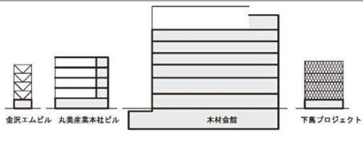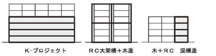 | 木造で耐火建築物が可能になったことで木造建築の可能性が開けてきたが、まだまだ建てにくい建物もある。例えば、鉄筋コンクリート構造のコアによりかかる平面混構造の木造建築や、耐火性能の高いRC造の大架構の中に3層程度の木造システムを組み込んだ、メガストラクチャシステムなどである。 木造を鉄筋コンクリート造や鉄骨造と同じ建築構造材料として適材適所で使い分けることができるようになると、新しい構造材料として木質材料をみなすことができる。 |