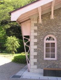 | ■紹介者コメント 岐阜市の上水道は「名水百選」(1985年・旧環境庁)に選定された長良川の伏流水を原水として供給されている。昭和5年(1930)、金華山ふもとの鏡岩に同市最初の水道施設となるエンジン室とポンプ室が建設され、水源地の井戸からくみ上げ、瑞龍寺山(通称:水道山)の配水池に圧送し、市南部地区に配水を開始した。 2棟はいずれも鉄骨造平家建、切妻桟瓦葺で、外壁はコンクリートに長良川の玉石を埋め込み、四隅には花崗石の隅石が積み上げられている。また正面(妻面)はアーチ型の入り口と上部に楕円窓を設け、両脇にアーチ窓を並べ、螻羽(けらば)は外壁から突き出した方杖が深い出を支える同一のデザインとしている。 一方、柱の構成や側面の窓廻りのディテールには相違が見られる。旧エンジン室では、鉄骨ラチス柱を外壁の外側に配置している。また旧ポンプ室の丸窓は花崗石と木の二重枠であるが、旧エンジン室のそれは花崗石の代わりに玉石を並べている。山小屋を思わせるユニークな意匠と、手作業で丹念に積み上げられた玉石の外壁には、当時の人々の水道創設に対する情熱が感じられ、今でも親しみやすい建物である。 これらの建物は昭和40年代(1970年前後)まで使用され、現在はそれぞれ「水の資料館」(平成14年開館)、「水の体験学習館」(平成17年開館)として生まれ変わり、市民に公開されている。また旧エンジン室は、金華山山中の岩盤をくり抜いて造られている鏡岩配水池の導水トンネルの管理用出入り口も兼ねている。 所在地:岐阜県岐阜市鏡岩408-2 登録番号:旧エンジン室 21-0037 旧ポンプ室 21-0038 |