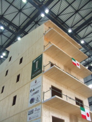 | 近年、ヨーロッパでは木質材料を線材としてだけでなく、面材として扱うことが注目されている。面材といっても、合板ように12mmや28mmといった厚さではなく、100mmや200mmといった無垢の厚板である。クロスラミナと呼ばれるこうした面材は、ラミナを直交させて積層することで大きくて厚い面材を再構成している。 厚い面材となった木質材料は、プレキャストコンクリート造の版のように扱うことができ、壁構造、フラットスラブ、キャンチレバーの床などの木造架構を可能にする。無垢の木材には、遮音性能、断熱性能なども期待されている。大きな線材と厚い面材を用いて木質構造建築の可能性はさらに広がることになった。 |