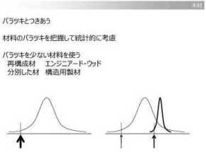 | 木材の性能のばらつきを抑えることができたのは、再構成材だけではない。通常の製材でも、材料のばらつきを抑えるシステムが構築されている。 ばらつきの大きい素材であれば、あらかじめすべての部材の性能を検査し、その性能を表示することで扱いやすい材料としようというものである。ばらつきが 大きい母集団の場合は安全率を高くするため、性能の低い材料の特性値に影響を受け性能の低い値で使用しなければならないが、あらかじめ性能のよい材料だけを選別して母集団をつくることによって、ばらつきを抑え高い性能値を用いることができる(上図参照)。 このように材料性能を管理された製材は、JAS構造用製材と呼ばれ、ヤング率と強度が表示され含水率も制御されている。しかし、誤解してはいけないのは、性能の高い木材が必ずしも良い材とは限らないということである。性能の低い材料でも、性能がきちんと分かっていれば、その性能に見合った構造形式、使用部位で用いることができるのである。性能の分からない材が一番価値の低い材なのである。これまで熟練の目利きの技術によってのみ判断することがで きた木材の性能の一部を、数値化することによって、より多くの人に木材を使いやすくすることが重要なのである。 また、木造建築では材料の太さは、必ずしも不快ではなく、民家の小屋組を見上げたときの迫力のように、心地よく感じる場合もあるのである。部材の太さとは、本来その素材がもつ独特のものであり、鉄の近代建築が目指す「細く、薄く」だけが理想とは限らないのである。 |