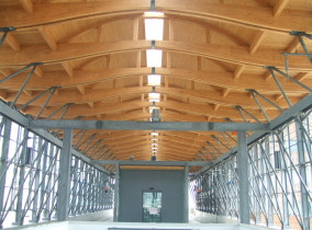| 大きな断面が製造できる再構成材のもう一つの長所が曲げ加工である。木造建築では、これまでも自然に曲がった木材をうまく利用して小屋組がつくられてきたが、再構成材では、意図的に自由な形に曲げることができるのである。しかも、単純な曲率だけでなく、日向市駅(2006)のようにS字型など複雑な部材をつくることもできる。 また、部材の切断、接合部の加工では、NC(数値制御)加工機も用いることができ、3次元的な複雑な加工もデータを作成すれば実現できる。 再構成材や構造用製材によってその材料特性が把握できたといっても、木材を使った材料であることは変わりなく、温湿度の変化による含水率変動、部材の伸び縮みといった木そのものの性能は完全になくなっているわけではないことを忘れてはならない。あくまでも、変動する自然材料とどう向き合っていくかが木質構造建築にとって重要なのである。 |