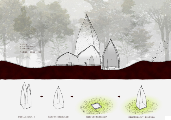 | 数年前に私が提案し、現在、オーストリアのウィーン工科大学大学院と共同で進めている新しい建材開発による住宅のプロジェクトを紹介します。 皆さんは、割れにくいシャボン玉、という製品をご存知でしょうか。誰もが遊んだことのある一般的なシャボン玉は、膨らませて飛ばしても、約10秒で割れてしまいます。数年来の玩具部門でのヒット商品である割れにくいシャボン玉は、一般的なシャボン玉液の調合を少しだけ変えて割れにくくし、土の上をも転がったりするシャボン玉です。飛ばすとすぐに割れてしまうシャボン玉よりも、子供たちが追いかけたときに一番楽しむことのできる割れにくさを追求して実現したシャボン玉です。また、最近は、カラーシャボン玉という玩具もヒット商品のひとつです。同じく調合を少し変えただけで、色とりどりのシャボン玉をつくることが可能です。 こうした、わずかに調合を変えるだけで楽しみ方自体も変わったこれらのシャボン玉をヒントに、実現に向けて研究開発を続けているのがバブルハウスです。 数年前から国内外の化学の研究者と打ち合わせを進めてきました。彼らと実験を重ねて特別に調合した液体樹脂を、建設予定地に一斗缶に入れて持参します。そして、建設予定地で多くの泡を生成し、連続した泡の建材として半ば固化した状態にしていくのです。それを、古典的な仕口や金物などではなく、同じく化学の研究者が特別に調合した糊で接着していくだけで、オクラのように、壁と屋根が連続するのです。それを、不陸をとった基礎構造の上に載せることで、あっという間に断熱性が高い内部空間を実現できるのです。また、泡の色や透光度を調整することができますので、例えば、下方は乳白色で不透明度を高くし、頂部へ向けて連続的に透明度を高くすることで、穴を開けたような古典的な窓ではなく、空間を構成し人を取り巻く四方八方の建材の透光度の度合いで、採光を調整することが可能となります。上方から柔らかい光が満ちてくる自立した内部空間が達成できることになります。 建築のみならず、人工物の質量が少なくなるということは、価格、労務、工期、危険性、地震時の揺れ、荷重など、さまざまな要因が大幅に軽減されます。 建築家が建材の調合から設計することで、建築の挙動も様相も変わるのです。 |