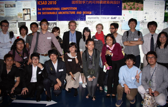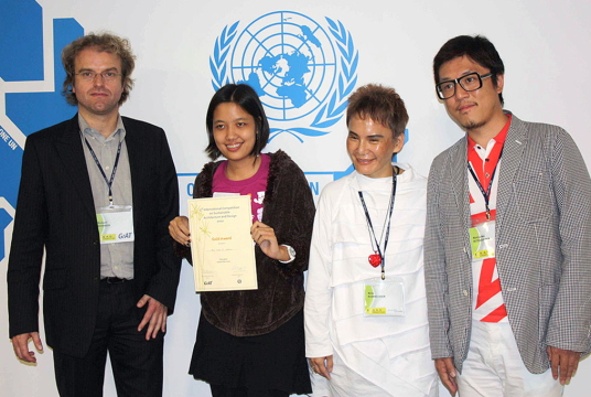 | 2010年の上海万博国連館で開催した国際建築学生コンペティション | 同コンペティションにて金賞のフィリピンのマプア工科大学の学生(左から2人目) | |