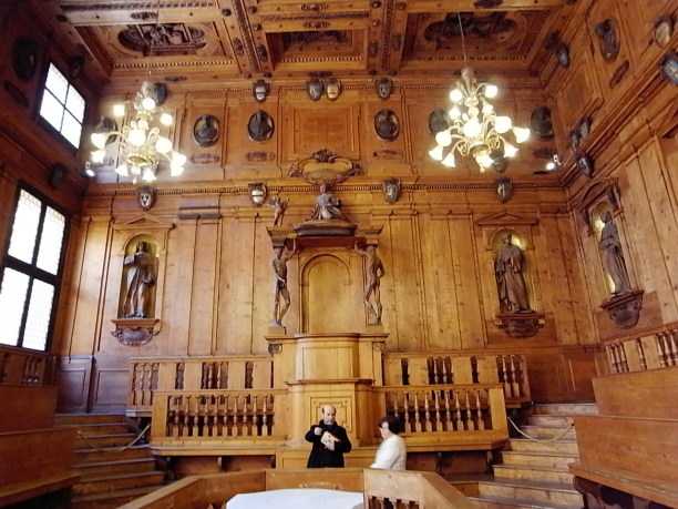 | 旧ボローニャ大学解剖室。 写真最下部の白い台に献体が置かれた |