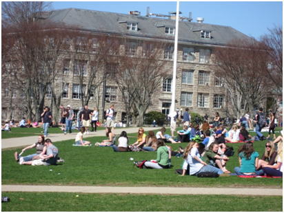 | 4月終わりごろ、寒かった季節も終わり温かくなった大学の広場 | ヤードセールで見つけたセット。テーブルに椅子2脚合わせて25ドル。奥の机とランプはHabitatから30ドル。フロアーランプは新品で30ドル | ソファはHabitat から40ドル。ランプ付きサイドテーブルはCraigslist で25ドル |
