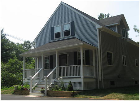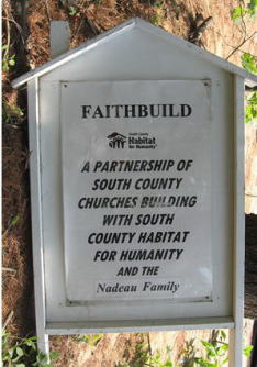 | Habitat が建てた住宅。私が借りた家より立派です | この家の敷地に捨てられていた看板。“South County地区の Habitat とNadeau Family と教会の協力によって建設された” | 不思議な換気扇。フードの中の黒い部分から給気して上の部分から室内に排気する |