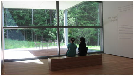 | 研修プログラムの中に、ハンコック・シェーカービレッジが含まれています。シェーカーというのは、18世紀末にアメリカ東海岸の各地で共同生活を行っていたキリスト教の1グループです。簡素な生活を旨に、シンプルで美しい家具や建築物を残しています。ハンコックのあるマサチューセッツ州の西部バークシャー地方は、北はバーモント州、西はニューヨーク州に接しており、ちょうど軽井沢のような気候で、ボストン・シンフォニーの夏の本拠地タングルウッドがあることでも知られています。 ハンコックから北に30分くらいのところにあるWilliamstownという小さな町に、安藤忠雄氏の最新作品(2008年当時)がありました。人口1万人足らずの町にあるThe Sterling and Francine Clark Art Institute内のStone Hill Centerです。2008年6月22日にオープンしたばかりで雑誌「TIMES」でも取り上げられ話題になっていました。The ClarkともいわれるThe Sterling and Francine Clark Art Instituteは、ニューヨークの大富豪Clark夫妻の個人コレクションをもとに設立された美術館とWilliamstown Collegeがタイアップして、美術史・評論や美術品の修復保存技術の教育プログラム(大学院)で知られているとのことです。そのせいか美術館にある美術品の数々は、他の美術館と比べると色彩が鮮やかです。 Stone Hill Centerは緑豊かな敷地の奥にあり、美術品の修復保存スタジオと展示室が併設され、入館者は中庭から修復の様子を見ることができます。あふれるような自然の緑を内部空間と連続させ、コンクリートの壁で額の絵のように切り取って際立たせたものでした。 7 ~8月は毎日開館、そのほかは月曜休みです。入館料は6 ~8月は有料で、11 ~5月は無料。教育プログラムの一環で学生には無料で公開されています。 |