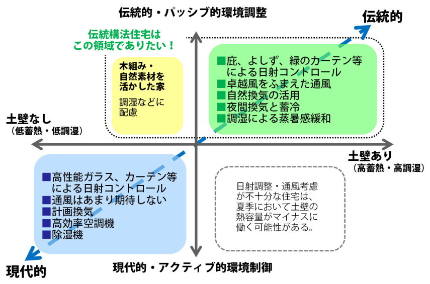 | 日本の伝統的な住宅(もしくは、土壁の住宅)は、夏は涼しいが冬は寒い、だから断熱気密を強化する必要があるのだという簡単化した説明がなされる。こういった議論では、江戸末期〜昭和初期に建てられたいわゆる「伝統民家」と、現在つくられている「伝統構法住宅」が混同されている場合も多い。継ぎ手仕口や土壁の使用など構法的には共通する部分もあるが、壁の納まりや開口部のつくりなど、温熱環境的には現代の「伝統構法住宅」は相当改善されている。現代の「伝統構法住宅」では、屋根や床を断熱する場合が多く、土壁の外側に、防湿透水シート張りの上に板張りなどとすることも一般的であり、開口部にはサッシが用いられる事例も多い。温熱環境の議論にあっては、チリが切れて外が見えていた「伝統民家」と、現代の「伝統構法住宅」を整理して扱う必要がある。 伝統構法住宅の温熱的な特徴は、土壁が有する「蓄熱性能」にあるといえ、これをどのように活用できるかが大きい。夏季においては夜間通風を活用した蓄冷、冬季においてはダイレクトゲインを活用した蓄熱を積極的にデザインすることが求められる。土壁を内包することにより気温の安定性が高まり、冬季には高い結露抑制効果も発揮する。夏季においては通風や日射コントロールにより、日中の暑熱を土壁に溜めないような工夫も求められる。窓の開閉や日射調整など居住者のライフスタイルや行動に依存するところも大きくなることから、環境共生的な生活を楽しもうとする居住者の理解も重要である。逆にいえば、高蓄熱材を内包しながら、夏季に日射遮蔽や通風が不十分であれば、かえって熱が室内に籠り、冷房依存を高めてしまう。土壁の有無と環境調整手法のイメージを私なりに図にしてみた(図1)。地域の気候と伝統、素材を活かすことのできる、冬暖かく、夏涼しい住宅をデザインする方法を考えていきたいものである。 |