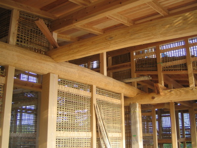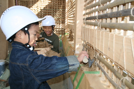 | 伝統構法による建て方 | 竹小舞 | 土壁塗り体験。住み手が参加できるところも大きな 楽しみ |
