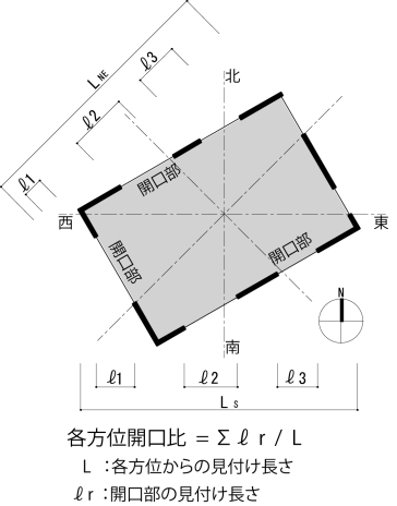 | 夏季における冷房使用の低減を図るには、「日射遮蔽」「通風の確保」「断熱」「蓄冷」「蒸発冷却」などが検討の主眼となるが、この中で「通風のデザイン」は極めて重要なファクターである。 著者らは民家における開口部形態の地域性を明らかにするため、郷土史や民家調査資料に掲載されている全国の近世民家の間取り図を対象として分析を行った。この研究では、概ね矩形の平面をもつ民家948件を対象に、図1のように8方位からの見付け長さに対する開口部見付け長さの比(各方位開口比)を用いて算出をした。開口比が0.5であれば、その方位では見付け長さに対して半分が開口部であることを示している。この指標では、中窓、掃き出し窓など高さについては考慮していない。 結果を統計的に処理し、地域的な類似性からゾーニングを行い、地域区分図(図2)を提案した。各地域のデータを平均した開口比をレーダーチャートとして示している。東北では開口部の大きさは最小限にとどめられ、南側を日射取得のため開放していることが分かる。一方、南九州では極めて開放的であった。関東では南および南西に開放しているのに対し、東海・南近畿では南北に開放するなど地域性が見られる。北陸・北近畿では各方位が同程度となっているが、山地などの地域地形や局所風に対応してさまざまな傾向が見られ、これを平均化したことによると考えられる。このように地域における配置方位や大きさには顕著な違いがみられ、日射取得、通風、採光などを考慮しながら、所在地における開口比が形成されてきたことが分かった。 |
