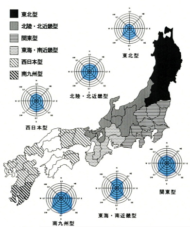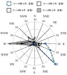 | 三品家住宅(宮城県亘理町)の平面図(図3)と開口比(図4)を見ると、南が約80%と高く、他の面は最小限の開口にとどめられていた。東北型の伝統民家の平均に類似している。縁側は後年になって付設されたものであり、古い時代ではさらに少ない開口部であったとの記述がある。最寄りの亘理観測所の風配図(図5)を見ると、冬季(2月)には昼夜ともに西の頻度が高いが、風が卓越する北西方向の開口部は抑制されており、あわせてこの方位には防風林(エグネ)がしっかりと設けられていた。8月には南東からの風が卓越するが、南東には住宅へのアプローチが設けられるなど開放されており、冬季の季節風を遮りながら日射を取得し、夏季の通風を可能としている。 | ||