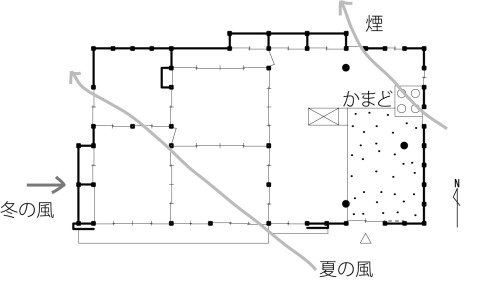 | 具体の伝統民家における開口部形態と気候条件との関係について、事例をあげて考察してみる。風況を表現するため、当該地域の拡張アメダスの風向データを整理し、各時間帯の風向頻度を求めた。民家の開口部配置と風況との関係について考察してきたが、対応が見られる民家とそうとは言えないものがあり、統一的な傾向を示すには至っていない。ここでは、風況との対応が認められた事例をいくつか取り上げてみたい。 | ||