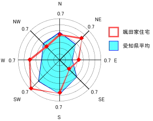 | 颯田家住宅(愛知県西尾市(旧:一色町))の平面図(図6)と開口比(図7)を見ると、南西と北東に大きく開放されている。最寄りの蒲郡観測所の風配図(図8)を見ると、8月の昼間には南南東の風が卓越し、夜には北北東の風が吹いているが、これらの風を取り込むことができる開口配置となっている。2月には西から北西の風が卓越しているが、この方 位の開口比は抑えられている。この建物の西側には物置が配置されており、冬季の季節風を遮りながら日射を得、夏季の通風を最大限確保した構成となっていた。 | ||