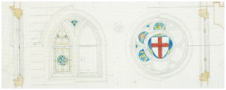 | コンドル設計、幻の教会ともいわれている。明治28(1895)年ジョセフ・ゴンザレスが興した日本聖教会小笠原島教会所は、明治42(1909)年聖ジョージ教会として竣工し、1944年第二次大戦の爆撃により消失した。小笠原島教会があったのは東京、竹橋から南南東にフェリーで約1,000㎞の太平洋上の父島。現在は同地に再建され、小笠原愛作牧師(旧名アイザック・ゴンザレス)が教会を守る。彼は戦前の小笠原島教会のステンドグラスについて「どうしてこんな田舎にこれほどのものがあるのか不思議であった」と少年時代の記憶を語る。手綴じデザイン帳にある木内のデザイン画(図1)は、10分の1縮尺で美濃和紙に彩色。ほかにもう3点。次ページには半円の彩色のないデザイン画「教会堂大入口欄間…ステント4