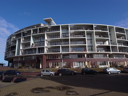 | アムステルダムの北東部に位置するKNSM島は、以前はアムステルダム港に属し物流機能を担っていた。その機能が移転した後の再開発計画を行ったのがヨー・クーネンであった。東西に伸びる中央ストリートの両側に、集合住宅を中心とした建物を配したことにより、風が強いKNSM島に歩きやすい街路環境を形成している。ストリートの突き当たり、島の東端に円形配置の集合住宅が存在する。集合住宅の手前には広場があり、ゲートをくぐると円形の中庭に到達する。さまざまな建築家によって島全体に建設されたその他の集合住宅群を含めて、多様な居住環境の選択肢を提示している。 | ||
