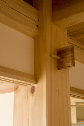 | ❸樹齢135年の檜の伐採(岐阜県八百津) | ❹大黒柱。差鴨居からの長ほぞと鼻栓 | ❺ロフトへの登り棒(伐採した檜の先端部) | ❻足をぶらぶらさせられる窓 |