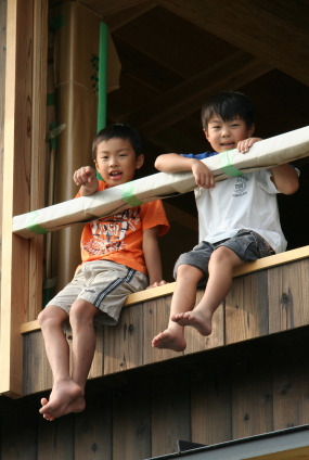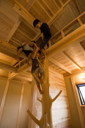 | 檜の伐採、製材、植林、鉋がけ、土壁塗り、タタキなど家づくりを通じて多くの経験を、子どもたちは積むことができた。環境教育、グリーンツーリズム、職業体験などが望まれているが、近くの山の木で「伝統的な構法」で家をつくる過程は、多くの学びの機会を内包しているように感じる。 トピックスとして、家族で参加した大黒柱の伐採とその後を紹介したい。製材所が所有する天然林で檜の伐採を行った(写真3)。みんなで選び、酒と塩でお清めをして、チェーンソーでの伐採が始まった。凄まじい音をたてて大木が倒れる様子は、衝撃的であった。切り株の年輪を子どもと数えてみると135年。生を受けたのは廃藩置県の頃だったことになる。設計の仕事では材寸を図面に記しておけば現場にモノとして材料が搬入されるのだが、目の前で木が伐り倒される様子は命を頂くという感じがして、材料との関係が変わる気がした。その後、子どもとともに製材を見学したり、植林を行ったりと楽しい体験ができた。 伐った檜の根元は大黒柱(写真4)に、先端部分は子ども室のロフトへののぼり棒(写真5)となった。のぼり棒は家の中で木登りができると子どもたちに大好評。建物の長寿命化は単にハードの問題ではなく、愛着や思い入れも大きいだろう。伐採や植林などを通じて、家づくりが木の命や山の生態系と繋がっているということを実感しながら、家族の思い出をつくることもできた。 |