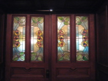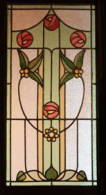 | 昨年11月、横浜市山手・イタリア山庭園内・旧内田家住宅(外交官の家)にて「ステンドグラスは語る」をテーマに講演の機会を頂く。明治43年、東京澁谷の南平台に建築され、平成9年、横浜市に移築と同時に重要文化財の指定を受けている。邸内のステンドグラスは村井邸に比べて数は多くないが、同様に質は高い。講演依頼を受け、さらに深く前記4邸、すべてのステンドグラスを丹念に見比べる。共通性を探し、デザインから辿ってみる。村井邸4枚扉(図5)、内田邸食堂窓(図6)の中に、それがあるではないか。ゼセッション風のデザインだが、モチーフがよく似ている。並んだ3つのバラの花、3つの実がなる3枚の葉、葉をつなぐアールの線。遅きに失した気付きだが、学会に、講演にとご来場いただいた方々に明治、大正時代のステンドグラスの歴史と面白みを伝える。 | ||