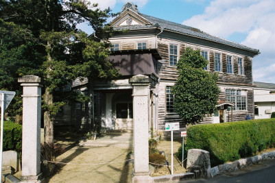 | ■紹介者コメント 伊勢別街道は、関を出て楠原を過ぎると林の集落に入る。旧明村である。郷中に入り東進し集落中央部で直角に折れて南下する。「旧明村役場」はこの十字路の北東角に建つが、西脇の小道を北へ入ると明治7(1874)年創立の明小学校がある。また、東進すると大同元(806)年創建と伝わる普門寺に至る。 役場庁舎は大正5(1916)年創建で、街道に接して南西角に門柱を構えている。平面形は矩形であるが、南西隅は道路角に対峙して隅切りし玄関ポーチを突き出し、ここを玄関としている。1階は客溜とカウンターを介して事務室があり、南東隅に階段を設け、その北側を和室としている。2階は1室の議場で南西隅からは玄関ポーチ上部の露台に出ることができる。外壁は下見板張で、南と西面は上げ下げ窓とし、他は引き違い窓としている。屋根は寄棟造り桟瓦葺きであるが、玄関ポーチ上に「明」をデザインした妻飾りを付した破風を見せ、正面性を強調している。 背面では西側に貴賓室を設け、東背面部には宿直・小使い室を角屋上に突き出させ寄棟造りの屋根を架けている。 役場庁舎の前庭には、現在では喬木が3本残っているが、当初は7種7本植わっていたという。明村が明治22年、忍田・楠原・中縄・楠平尾・林・萩原・福徳の7か村の合併により成立したことに由来している。なお、正門の石柱や敷地境の石積みも登録対象としている。また、当初の設計図である「明村役場建築工事之図」が残っていることも貴重である。 この庁舎は、現在、特に玄関ポーチ回りの腐朽が進行している。所有者である津市も保存対策を講じているようだが、一刻も早い修理・公開が望まれる。 ところで、伊勢別街道を下り街道沿いの一身田にある専修寺境内には、旧一身田村役場の遺構が現存し、「高田婦人会館」として活用されている。 |
