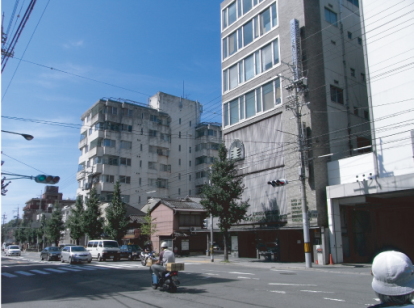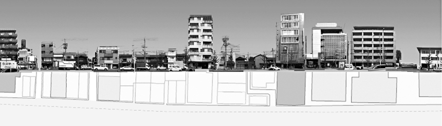 | そんなとき、京都の市街地のとあるメイン道路に面して建つ事務所兼店舗施設の建て替え計画、設計について検討する機会があった。規模は小さく通常の戸建て程度、あるいはそれ以下のスケールである。近隣に著名な寺社仏閣もあり、歴史の重層性も感じられる地域であることから、事務所兼店舗という建築の内的条件を満たすことは当然のことながら、地域あるいは通りの景観形成の一端を担う建築として何がそこにあればよいのか、どのような存在・たたずまいがありえるのかを常に考えながらの検討となった。スケールは小さいながらも、このような建築物の集積が、通りの、あるいは地域の景観を形成することになる。 検討に当たって、形態や色彩その他、あるいは通りを特に特徴づける要素や、周辺環境の中で規範となりそうな事項、また地域や通りの文脈がきっと存在するであろうこと、そしてそれを読み取り計画に反映させることが可能であり、必須であると考えた。そこで、まず通りを構成する建築物の連続立面写真(写真1)を作成し、状況を把握することにした。しかし思いに反して、有効な手がかりを得ることが困難であり、むしろかえって混乱を生じる結果となった。 沿道の建築物群(現況建物も含む)には、強い連続性や秩序も見出しがたく、このような景観にどのような接続を行うべきか、頭を悩ませることとなった。 そんな中、店主の母の子どもの頃の記憶として、店舗前面の街路樹を用いてゴムとび遊びを行っていたこと、昔はこのあたりは雑木林であったことなどを知ることができた。そのような時間軸上での地域の特性や隣地の条件、その他諸々の条件もかさなって、隣地を取り込み敷地面積を確保し、街路樹の存在ともあわせ、雑木群を配し、そうした環境の中での佇まいをコンセプトとして検討を行うことにした(実際には施主の敷地の高度利用の要求との間に挟まれることになる)。顛末はさておき、そんな事例から考えたことを記してみたい。 |