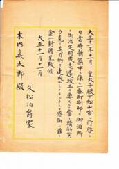 | 木内真太郎の娘、故富左江さんのメモに「久松家感謝状あり」とある。その感謝状がなかなか見つからない。「感謝状ってなんでしょうねー。見たことありま せんか? おばあちゃん(富左江さん)の部屋の隅からでも出てきませんか?」と幾度もカオルさん(玲光社2代目保英氏の妻)に聞くが、「知りません」との返事。 木内真太郎の研究から2年ほどしたある日、電話でカオルさんに「明日調査に参ります」と伝える。翌日、大阪の木内家を訪れると、真太郎の回顧録「自己記・昔の昔」と伯爵家感謝状が出てきたことを知る。彼女は私からの電話を受けた直後、仏壇の上の隙間のずーっと奥からこれらを探し当てた。「私も初めて見ました。ここから見つかったということは、金田さんには真太郎おじいちゃんがついてはる。不思議や」とカオルさんは言う。 感謝状には「大正11年11月 皇太子殿下松山市ヘ行啓ニ付當時新築中ニ係ル一番町別邸ヲ御泊所ニ御治定相成急遽竣工ヲ要スルニ當リ精励努力克ク其目的ヲ達成セシメラレタルヲ感謝シ茲ニ金一封贈呈致候 大正11年11月 久松伯爵家 木内真太郎殿」とある。萬翠荘に伝わる摂政宮(皇太子であった昭和天皇)の松山行啓に関しての内容はここに一致する。ほとんどの資料が失われていた萬翆荘にとって、この感謝状は貴重な資料だ。行啓のため竣工を急いだ、という事実が初めて認識された。 |