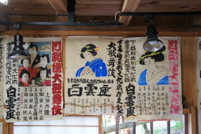 | ■発掘者コメント 白雲座は下呂から20分ほど中津川方面へ戻った門和佐部落の白山神社境内に、山深い景色を見下ろすように建っています。名前は白山神社に由来しているようです。 建物は「門和佐の舞台」として国重要有形民俗文化財に指定されており、切妻屋根、妻入りの貴重な劇場型舞台空間です。江戸時代末期に拝殿型の舞台部分がつくられ、その後客席部小屋を増築して明治23(1890)年3月27日舞台開き。その記録を、舞台内部の柱や壁に書かれた落書きの中に見つけることができます。建物は間口約16.4m、奥行き約20m。舞台は間口10.9m、奥行き9.1m、回り舞台の直径5.4m。450人を収容する2階桟敷を持つ芝居小屋です。 舞台下に下りると、コマを人力で回す押し棒やすっぽんがあり、楽屋や裏方のスペースは傾斜地を利用した明るい空間になっています。 江戸時代以来、農民の大きな楽しみは祭礼の奉納行事として自ら演ずる地芝居・農村歌舞伎で、江戸から役者を呼び本格的に競演するほど力の入ったところもありました。昭和に入り戦争と新しい娯楽のために衰退しましたが、近年になって地域伝統文化復興の機運が高まり、文化遺産を生かした地域の活性化にと復活。現在全国で182の保存会があり、うち56会が東海地方で、特に東濃地方は熱心に保存されています。 白雲座も昭和40年代には幼稚園や寒天倉庫に使用された後、取り壊し売却の話が出ましたが、昭和53(1978)年国の文化財指定を機に、地元の方々の熱意と努力によって「白雲座歌舞伎保存会」が結成され、毎年11月の白山神社の祭礼に合わせて「白雲座地芝居公演」が行われるまでに復活し、町内外の人々の楽しみとなるとともに次代へと受け継がれています。 入場料は取らずに神社寄進の形でいただくお金と公演冊子の広告料など300万円で興行費用を賄っているようで、場内に張られた寄進札が村芝居の雰囲気を盛り上げています。 |
