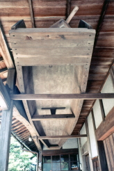 | このほかに輪中地域の水防の工夫として「上げ舟」と「上げ仏壇」が挙げられます。上げ舟は非常用の舟を常備して軒下、または土間の梁下に吊るしておくものです。母屋の入り口近くには柿の木などが植えられ、出水時にこの舟をつなぐ、「舟つなぎの木」として利用されました。 上げ仏壇は母屋の仏壇を出水時に天井の板を外して、天井裏へ滑車を用いて吊り上げるものです。浄土真宗の盛んなこの地域では、各家に置かれている仏壇が真宗特有のもので立派で大型なため、水屋に運び込むのではなく、母屋の天井裏に上げる工夫がなされました。 現在水屋は、一段高い所に建てられているため使用する際の不便さ、維持や管理のため修理などに多大な費用がかかってしまうこと、堤防が整備され洪水に見舞われることがほとんどなくなったことなどの理由から、新たに建設されることはごくまれで、古い民家の改築などにより減少するのに合わせてその数も激減しています。 しかし、水屋が果たしてきた防災の意義が再認識され、先人の生活の知恵が見直されて、荒廃していた水屋を修復した家も少なくありません。大垣市釜笛地区では、多くの家が規模の大きい水屋を残し、修復も行われており、伝統的民家の景観保存の観点からも注目すべきで、地区全体の在り様など、今後我々がサポートしてゆく義務を感じています。 |