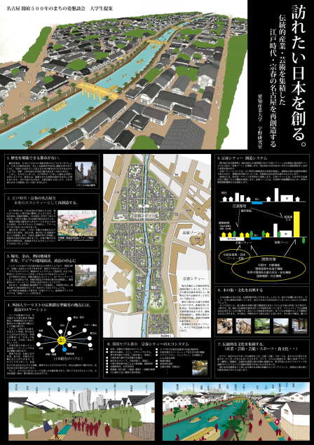 | 名古屋開府400年にちなみ、名古屋市に「開府500年のまちの姿懇談会」が2009年に設置された。100年後の名古屋のまちの姿を提案しようとするものである。下図は、わが研究室が提案したパネルである。河村名古屋市長の前で、学生がプレゼンを行った。今回は連載の最終回であるので、研究室で学生と語った夢想にしばしのお付き合いを願いたい。 日本のオリジナルとは何かを考えたときに、木と土の空間、自然と共生したしなやかな生活が思い浮かぶ。20世紀型の社会システムが行き詰まりをみせる中、250年間続いた持続可能な江戸の社会システムから学ぶことは多くあるだろう。日本人は海外を訪れ、美しい伝統的な町並みに感銘を受ける。一方で、江戸時代の日本に憧れる外国人は多いものの、外国人が訪れたいと思える日本の都市はどれだけあるのだろうか。海外には、破壊された伝統的な都市を再生した例もある。300年前の名古屋を、100年かけてつくってもよいのではないかと考えた。 江戸時代の末、日本を訪れた外国人たちは、森のように美しい街の姿に驚嘆したと言う。当時の街は、資源が循環し、川は澄み、幸せそうな人々が住む、世界でも稀にみる持続可能な社会であった。環境や持続可能性が大きなテーマとなるこれらの時代。江戸モデルとして具現化し、アピールすべきではないか。これからの基幹産業のひとつとして観光産業を確立する上でも有用であろう。 まったくの仮想だが、堀川沿いのある地域を「宗春シティー」と名付け、德川宗春(1696 ~1764)が藩主を務めた江戸時代の名古屋を、再創造することとした。宗春は、遊興や祭りを奨励して尾張名古屋を活況に導いた。艶やかな宗春時代の雰囲気は、再創造するにふさわしいイメージではなかろうか。ここでは土と木を活かした伝統構法による建築群と自然と共生した暮らし、さまざまな営みが展開される。オランダの都市計画を参考にしたという設定で、堀川を軸に幾何学的な道路を計画している。散策すれば、伝統工芸や産業、食文化、芸能など日本文化をのんびりと体験、満喫する空間となればよいだろう。駐車場やエネルギープラントなどは地下に設け、中部空港と宗春シティーは堀川を通って高速ソーラーシップや木造の帆船で結ぶ。あわせて、隣接するエリアに超高層オフィスを建設し、環境分野での経済のセンターをめざす絵とした。我が国の森林が荒廃から脱し、木の文化を再構築したいという思いもある。 木の街は、時間をかけて創れば良く、木の香りや鎚音、職人の仕事ぶりは見ていて気持ちのいいもので、これも景観になりうる。つくることで技術者が育まれ、多くの人が体感することで裾野が広がればいい。江戸時代の日本は、持続可能なエコシティー、ガーデンシティーであった。ブラジルのクリチバ、韓国の清渓川のような、都市としてのチャレンジがあってもよいのではないだろうか。 |