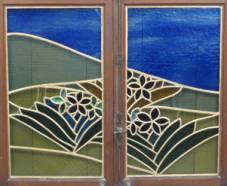 | 平成14年、博物館明治村飯田喜四郎先生からステンドグラス修復のお話を受けた。東京都世田谷区から岡崎市に復元移築のため解体保存されている本多忠次邸のステンドグラスだ。同年9月の暑い日、岡崎市教育委員会生涯学習課係長I氏と保存管理場所まで出かけ梱包を解き調査をした。思ったほど傷んでいないものと、大きく膨らみ修復しなければならないものとが混在した。真太郎時代の色ガラスを保存し、修復技術を持つ玲光社に連絡を取り、同年、11か所14枚の修復を執り行う。制作者は真太郎ではなく、宇野澤の流れをくむ技術の高い職人らしいことを本多家の資料から推測できた。色使いは見事で、当時よく使われたデザインだ。本年7月修復が完了し、一般公開中。 | ||