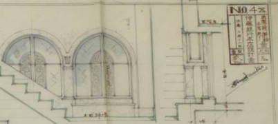 | 資料収集の調査中、鈴木禎次のサインが入った三菱東京UFJ銀行の前身だった伊藤銀行本店設計図面に出会った。史料では、3階客室(貴賓室)とベランダに通じる欄間のステンドグラスが知られていた。今回の研究でさらに1階からの階段室に「ステンドグラス」と書き込まれた図面が新出。「伊藤銀行本店、設計図面NO.48 西階段詳細図1階廻り」。美濃和紙手描きの美しい図面だ(図2)。これらの詳細は不明だが、禎次はステンドグラスのある空間を、建築のステータスを高めるために必要としたのだろう。残念なことに建物は現存しない。代々続く松坂屋伊藤家の資産管理会社である伊藤産業合名会社と地下で結ばれた、私的要素の強い贅を尽くした銀行であった(本年9月、「伊藤銀行本店」と題して名古屋大学での日本建築学会大会にて発表)。 | ![]() |