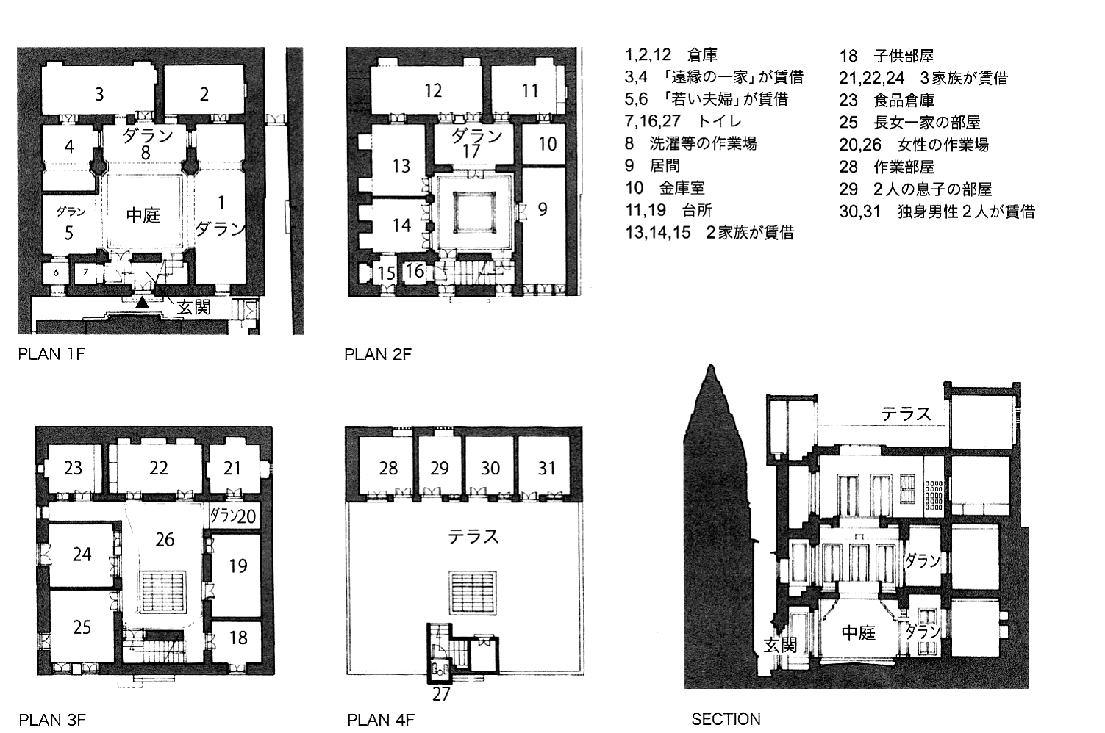 | 図1:ヴァーラーナシーの典型的な伝統的住居。家主一家に親戚や間借人の家族、あわせて10 世帯42 人が居住する (出典:Couté, Pierre Daniel ; Léger, Jean Michel, "Bénarès : un voyage d'architecture", Paris : Editions Creaphis, 1989) |