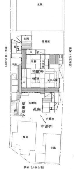 | ■紹介者コメント 名古屋大学建築学科卒業で、同期の神谷昇司氏(人間環境大学教授)が茶室研究の専門家である理由の一つは、代々続く名古屋裏千家の出身であることによる。学生時代から周辺の先生・学生たちを自邸に招いて茶道のたしなみを啓蒙していた。私も何度か茶室に案内され薫陶を受けていたにもかかわらず、郷土の文化的価値に気付かなかった。 三河武士の流れを汲む神谷家が江戸期に大須で紙問を興し、明治維新後に茶道師範を務めた清寿院院主の村瀬家と姻戚となり、当地に居を構えた。戦災にも遭わず今日では周辺を高層ビルに囲まれ、外からの望見は困難である。孤葊(こあん)は西区幅下の日比野邸から、柏露軒(はくろけん)は中区大須の村瀬玄中邸からの移築であり、腰掛待合と中潜門(なかくぐりもん)は大正期に建設されたが、その後の曳家の際、東大寺や熱田神宮の古材が用いられている。正真正銘の数寄屋造りであり、芸どころ名古屋の証として誇りえる建築に間違いない。このような文化そのものを建築空間も含めて、中心市街地の中で末永く遺していくための、保存と継承・発展のための施策と法的整備を急がねばならない。 所在地:名古屋市中区新栄2-10-4 構造・建築面積・年代・登録番号: 孤葊/木造平屋建て、銅板葺き、10.2㎡、江戸時代後期・明治44(1911)年移築 23-0342 柏露軒/木造平屋建て、桟瓦葺き、77.7㎡、天保5(1834)年・明治44(1911)念移築 23-0341 腰掛待合/木造平屋建て、銅板葺き、1.3㎡、大正12(1923)年・平成7(1995)年曳家 23-0343 中潜門/木造平屋建て、桟瓦葺き、間口1.7m、大正末期から昭和初期・平成7(1995)年曳家 23-0344 |