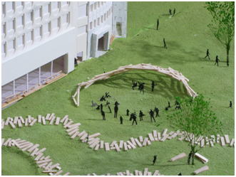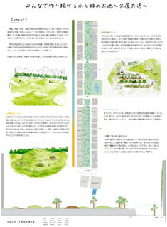 | 写真1、2および図2は、一昨年、名古屋市の久屋大通公園の将来を考えるワークショップ参加に際して、研究室で提案し た、久屋大通公園の将来像である。 現在の久屋大通公園および周辺に関して、車道、歩道、民地、公園の物理的な境界を取り払い、緑の大地として一体化する構想である。常に市民が場づくりにかかわっている状況、動的な空間としての公共空間がつくり出せればと考えた。 仮設的、ダイナミックに場所をしつらえる手法、みんなで場所づくりにかかわる仕組み、そんなところをテーマのひとつとしたものである。 「みんなでつくり続ける水と緑の大地~久屋大通~」とタイトルをつけたが、公共空間づくりの枠組み自体を捉え直すことも意図したものである。 |