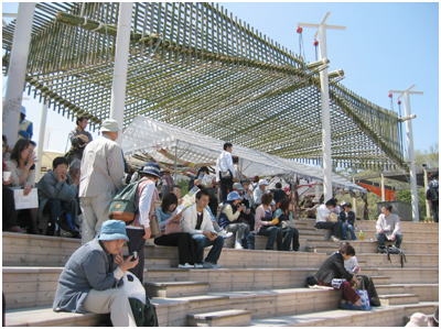 | 写真3 愛知万博・瀬戸会場「竹の日よけ」 | 図3 愛知万博・瀬戸会場「竹の日よけ」提案 | |