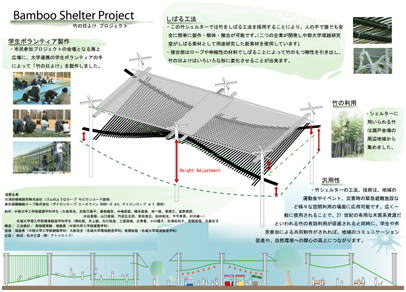 | 写真3および図3は、2005年日本国際博覧会(愛知万博)に際して、瀬戸会場にて作成された「竹の日よけ」である。 愛知万博は市民や非営利団体・非政府組織などが、計画立案や運営に参加できる市民参加型万博として、2005年3月~ 9月の185日間開催されたが、本案は、当博覧会において、21世紀の有用な木質系資源だといわれる竹の有効利用および参加型のデザインを提案し、市民参加プロジェクトの会場となる瀬戸会場の海上広場に「竹の日よけ」として実現したものである。 大学連携の学生ボランティアによりおよそ10日間にわたって会期前の海上広場で手作業により制作が行われ、185日間設置の後、同学生たちの手によって解体された。 特に、市民の手でも安全に簡単に製作できること、制震性や耐久性など会期中安全性が保たれること、魅力的な空間が形成されること、汎用性のある提案とすること、材料は身近な地域(瀬戸会場周辺地域)から集めること、などが課題となった。 技術的な特徴としては、この構造物は、ロープや伸縮性の材料でしばることによってのみ、接合を行っている。竹をしばる工法を採用することにより、人の手で誰でも安全に簡単に製作・解体・撤去が可能となることを考えた。このような、空間づくりは農村歌舞伎の小屋掛けにもヒントを得たものである。 提案の背景には、まちのあちらこちらに、また山に、放置されている竹林の問題もある。建築的な空間づくりへとその利活用の幅を広げることも意図された。 万博というイベントでの実現であったが、提案としては、子どもの遊び場づくりや、市、まつりなど、地域の場づくりへの展開を図ったもの である。 |