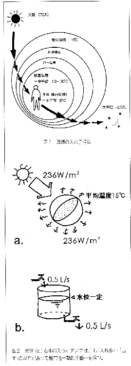 | 私たち人を含むすべての生き物にとって究極の資源は何か? この自明とも思える質問に対して、多くの人々は「太陽」と答える。これは誤りではないが、正答というわけにはいかない。それは図1に示したとおりで、地球環境が平均15℃に維持されているのも、人体の深部温度が平均37℃に保たれているのも、高温の資源を必要条件とすれば、その一方で、放熱が保障される低温の環境空間が十分条件として存在しなくてはならないからだ。資源が資源たるには、放熱先としての環境空間が不可欠なのである。 くどいようだが、地球表面が吸収する光と、地球が宇宙空間に放出する熱を、図2のa.にそのエネルギー流量率の数値とともに示そう。北極から赤道・南極までの地表面のすべてについて平均すると、1㎡あたりに毎秒236J(=236W/㎡)の光が吸収され、同量の熱が絶え間なく宇宙空間に放出されている。両者があって平均温度15℃は実現されている。 図2のb.は、a.に示した光と熱の出入りを、タンクにおける水の出入りのアナロジーとして描いたものである。蛇口からタンクに入ってくる水が太陽からの光、タンクの底に繋がれたパイプとその先にある蛇口から出ていく水が地球から宇宙空間への熱、タンクの水位が地表面の平均温度に対応する。 入れて出す。地表面の平均温度もタンクの水位も恒常性―動的平衡―が保たれるには「入り」とともに「出」が重要なのである。恒常性は「流れ」のなかにつくられる。人を含む生き物の形態(カタチ)、それらの生き方(カタ)、人のつくる建築のカタチ(構造)とそのカタ(機能)―これらはみな「流れ」があって、その中に現われるのだと考えることができる。 建築環境における光や熱・空気の「流れ」もまた同じである。不自然でない本来の明るさ・温かさ・涼しさは、建築環境空間を貫く「流れ」がほどよいときに初めて現われるのだ。だからこそのパッシブデザイン技術なのである。 |