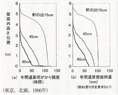 | 雨水で意外と見落としがちなのが跳ね返り水である。軒先から落ちた跳ね返り水は最大110cmも飛散する。直接地面に降る雨水の飛散距離は35cm程度であることから、樋の重要性が分かる。デザイン上、あるいは積雪のために樋を設けない場合は、跳ね返り水の対策を十分に行う必要がある。例えば、軒先直下に砂利や植栽を設ける、外壁下部の防水対策を十分に行う、などである。伝統的な木造住宅では外壁を腰高まで張り上げているケースが多いが、これは直接降りかかる雨水と跳ね返り水への対策であろう。 | |||
