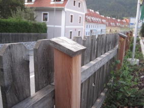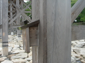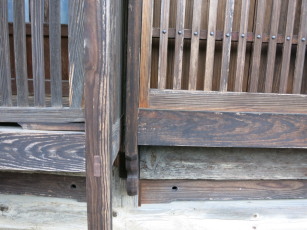 | まず、屋根の勾配と流れ長さに適した屋根葺き材を選定することが重要である。その上で、直接降りかかる雨水が外壁に作用しにくいように、軒や庇の出を確保したい。近年、デザインを優先させた結果か、軒の出の小さい、あるいは軒のない住宅が見受けられるが、耐久性上はあまり好ましくない。屋根は特に雨がかりが多い場所として、防水材料や構法が成熟しているが、外壁は開口部周りの複雑な納まりなど、防水上欠点ができやすい。外壁に直接降りかかる雨水に対しては、軒の出を大きくすることが、単純でかつ効果が大きい。図1に壁面の雨がかり負荷の計算例を示す。軒の出を大きくすると劇的な効果が期待できることが分かる。軒の出はできれば60cm確保したい。 言うまでもなく、屋根による躯体の保護は最も簡易で確実であるので、特に伝統的な木造構法においては、外壁に突出した梁や母屋の鼻先の保護や、木橋の横架材の鼻先の保護などに多く利用されている(写真1)。木製看板の保護や、外構の杭頭の保護なども屋根の一種であろう(写真2)。いま一度基本に立ち返って、屋根の効果を見直すのもよいだろう。 |
